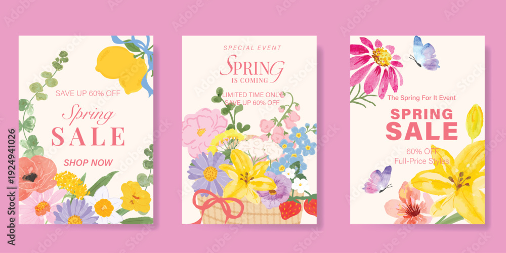 Fototapeta na wymiar - watercolor Spring Floral invitation card vector. Hand drawn botanical flowers template background. Design illustration for wedding, vip cover, poster, rsvp modern card, birthday party..