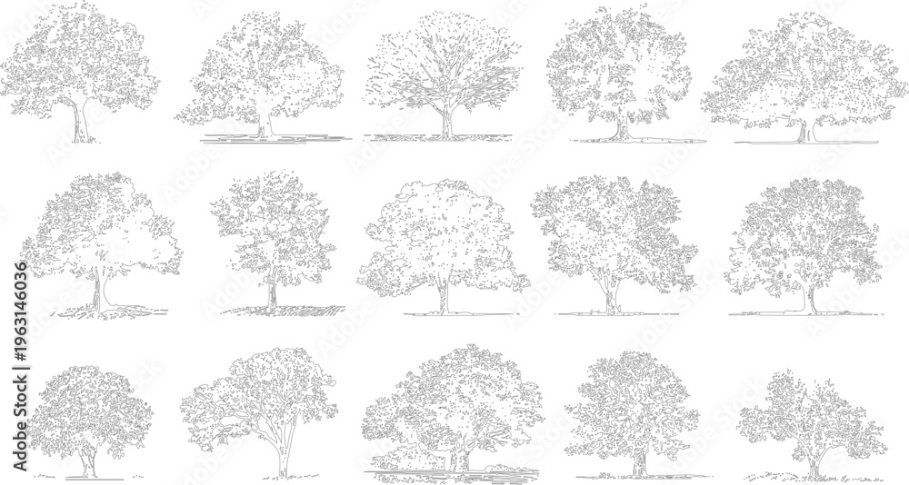 Fototapeta na wymiar - Collection of fifteen detailed black and white line of various deciduous trees with textured foliage and visible roots.