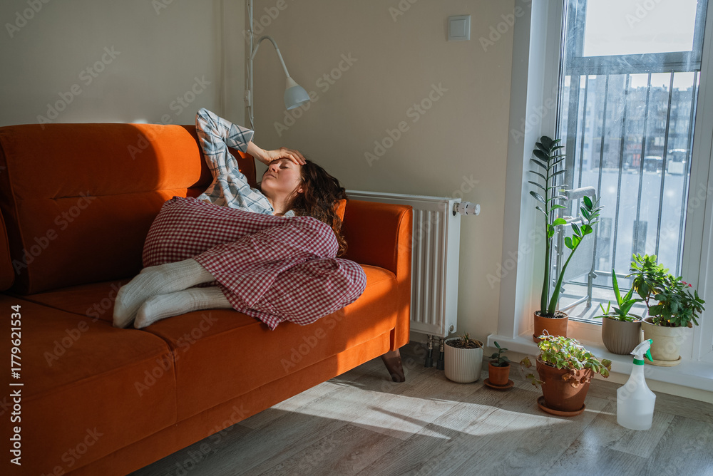 Fototapeta na wymiar - Young pregnant woman with toxicosis resting on a sofa under a blanket, looking unwell and fatigued from nausea and headache during early pregnancy at home.