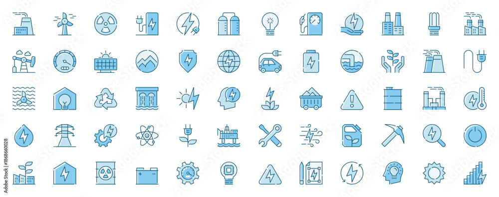 >Fototapety na wymiar>Wybrane motywy - zobacz więcej !>Tapety w deseń>Power energy web icons set in line design. Duotone pictogram pack of plant, wind turbine, charging stop, electricity, light bulb, fuel, oil production, more outline stroke signs. Vector illustration.