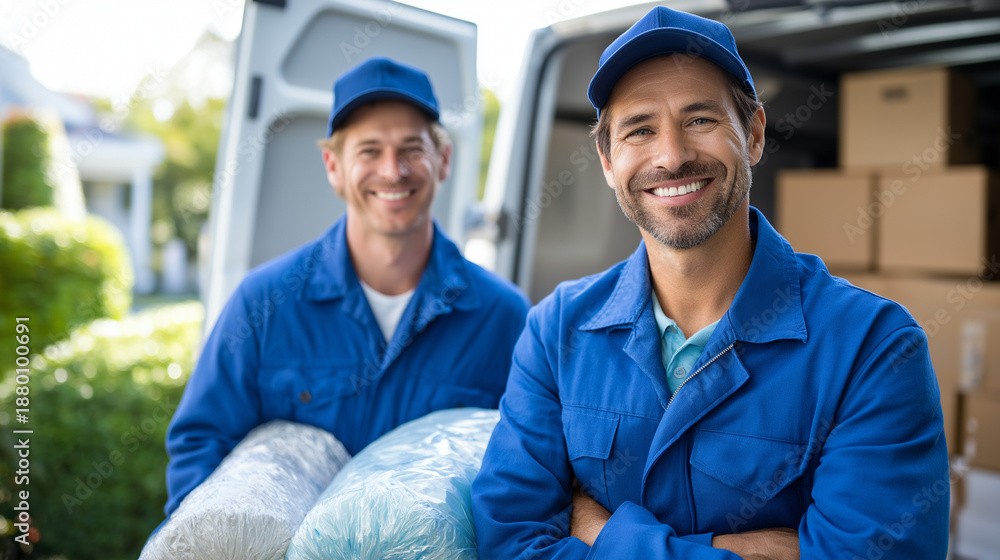 Fototapeta na wymiar - Two male movers in blue uniform carrying wrapped mattress from house to van, faceless workers, furniture delivery service, relocation team, loading boxes nearby, with copy space.