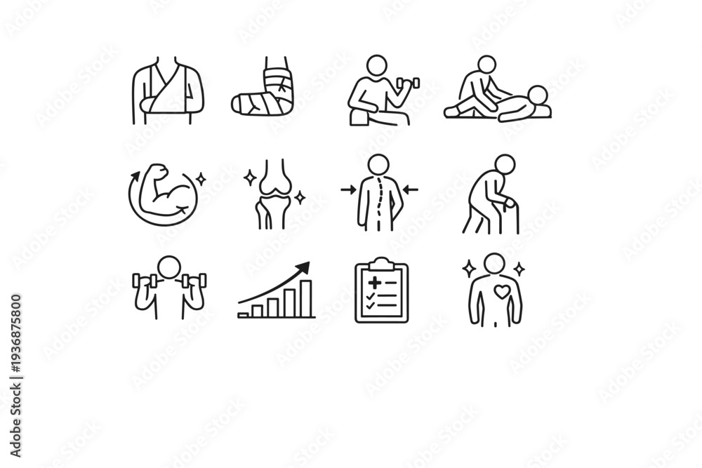 Fototapeta na wymiar - Physical recovery. Line icon set of Physical recovery: injured arm sling, broken bone cast, rehabilitation exercise, physical therapy stretch, muscle recovery,.