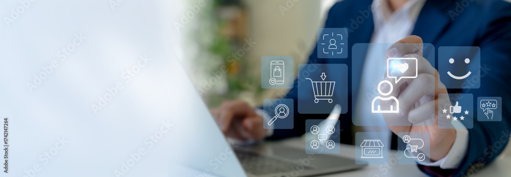 Fototapeta na wymiar - Customer experience and digital marketing concept. Interacting with a digital interface showing icons customer experience, online shopping, feedback, marketing strategies and personalized engagement..