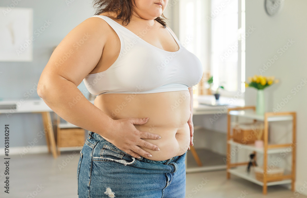 >Fototapety na wymiar>Wybrane motywy - zobacz więcej !>Tramwaj>Close up cropped view of plus size woman standing at home, holding her waist with her hands. Overweight female touching stomach, showing body insecurity, health concerns and focus on weight loss.