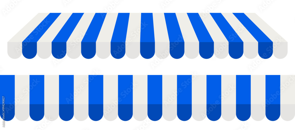 Fototapeta na wymiar - Blue and white striped shop awning. Vector illustration of a store or market canopy isolated on transparent background..
