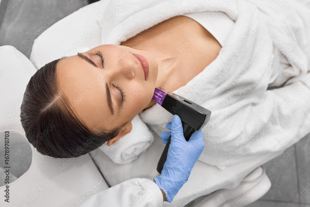 Fototapeta na wymiar - Beautiful woman enjoys while microneedling RF lifting for her neck and body skin tightening with cosmetologist at beauty salon.