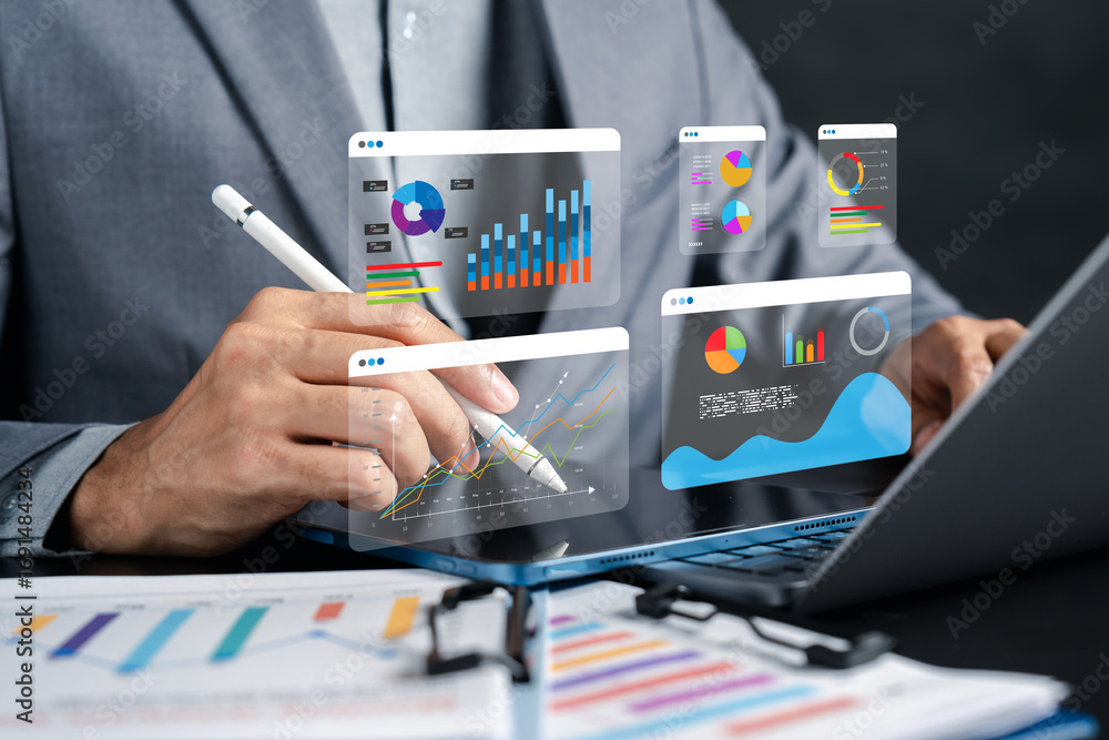 >Fototapety na wymiar>Wybrane motywy - zobacz więcej !>Tygrys>Investment strategy planning with digital charts, graphs, and financial reports, showing data analysis, market trends, economic growth, business forecasting, and financial decision making for success.