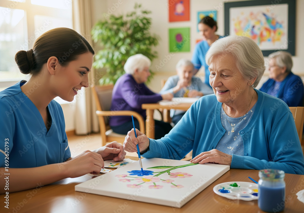 Fototapeta na wymiar - A caring young nurse or caregiver assists a happy senior woman as they paint a colorful picture together. .