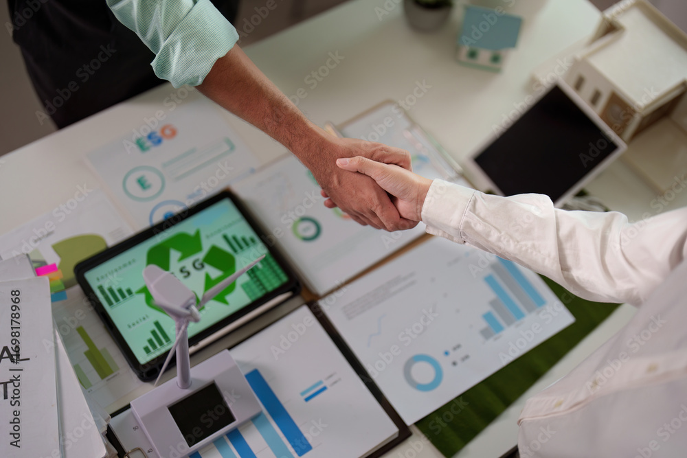 Fototapeta na wymiar - Top view of professionals shaking hands over ESG reports in a modern office..