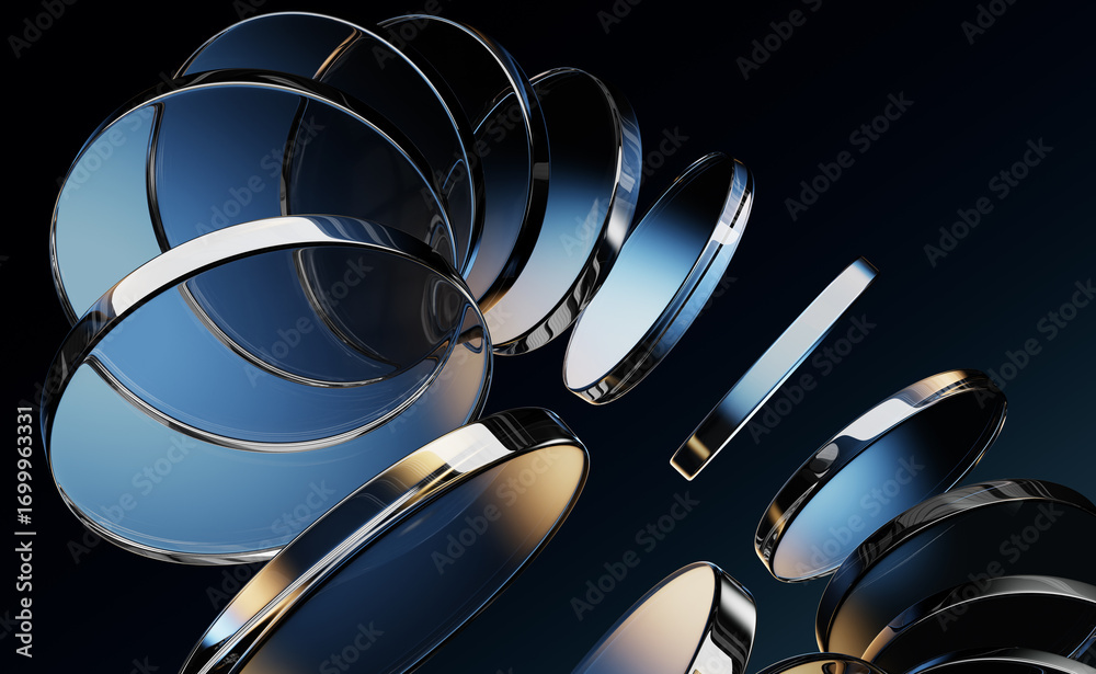 Fototapeta na wymiar - Abstract dark 3d background with neon glass circle disc and blue brown gradient. Circular ring motion effect of crystal round disks, holographic transparent lens. Digital tech banner. 3D illustration.