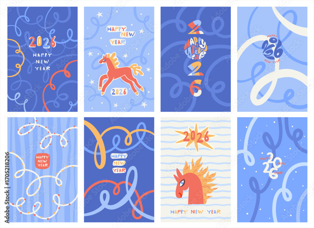 >Fototapety na wymiar>Wybrane motywy - zobacz więcej !>Tygrys>Happy New Year 2026 winter backgrounds set. Hand drawn greeting card poster rectangle templates collection. Serpentine spiral doodle uneven lines stripes pattern. Fire horse cartoon cute illustration