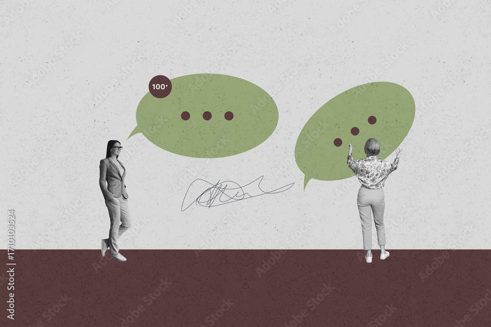 Fototapeta na wymiar - Collage with person surrounded by message bubbles symbolizing chatting communication online interaction business.
