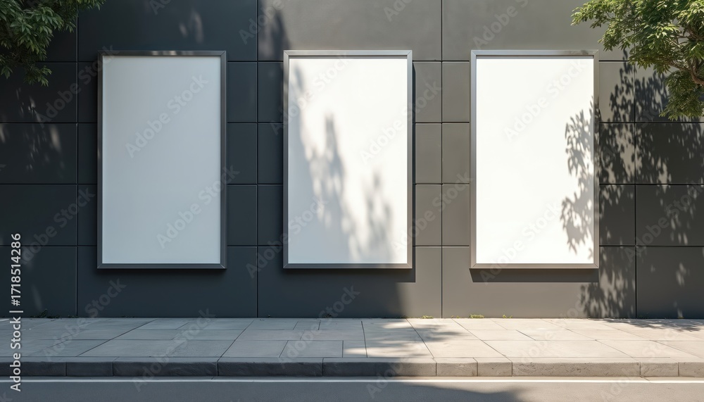 Fototapeta na wymiar - Three blank billboards mounted on dark tiled wall provide ample copy space for advertising, promotions. Outdoor display area with sidewalk, tree shadows, ideal for marketing, retail, public.