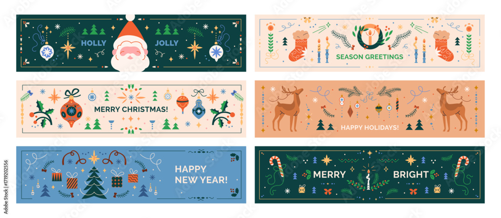 >Fototapety na wymiar>Wybrane motywy - zobacz więcej !>Tygrys>Merry Christmas and Happy New Year, festive banners set. Winter holiday greeting backgrounds, horizontal designs with seasonal ornaments, Santa Claus, Scandinavian patterns. Flat vector illustrations