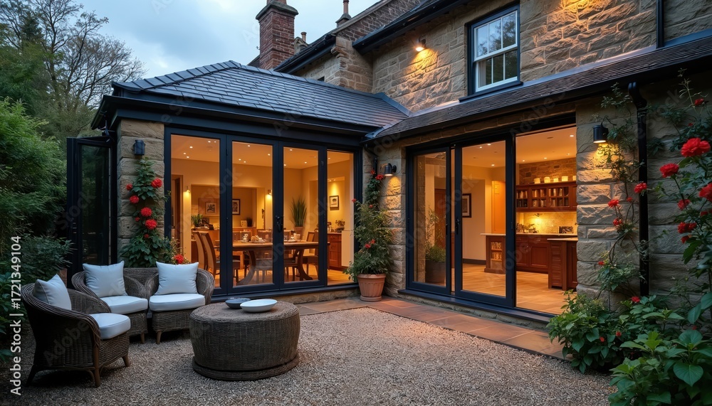 >Fototapety na wymiar>Wybrane motywy - zobacz więcej !>Tygrys>Classic English house exterior with modern extension. Stone facade features large bi-fold glass doors opening to well-lit dining area, kitchen. Outdoor patio with wicker furniture, gravel flooring.