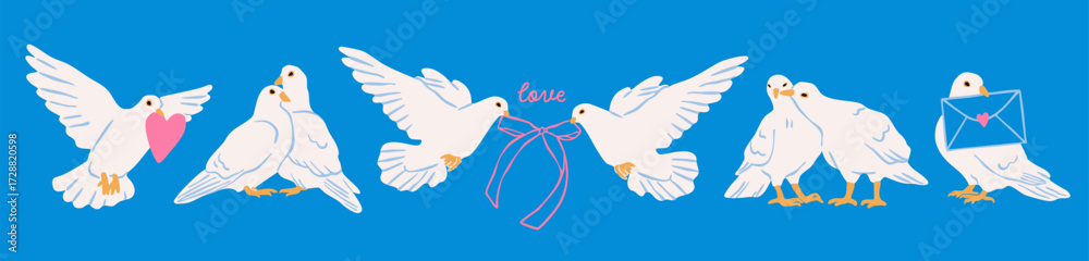Fototapeta na wymiar - Various white Dove birds set. Pigeons with ribbon, heart, envelope. Hand drawn Vector illustration. Valentine's Day, love, romance concept. Print, greeting, postcard template. Isolated design elements.