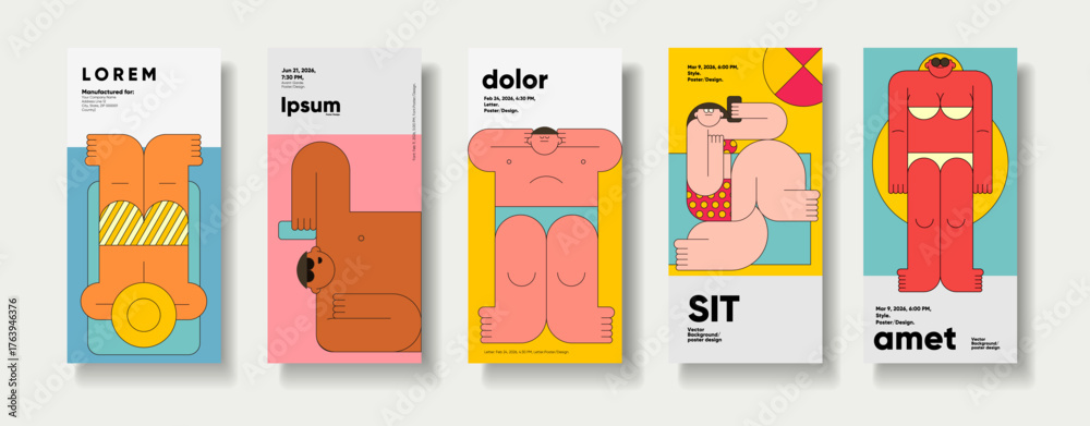 Fototapeta na wymiar - Summer. Beach. A modern set of five abstract posters featuring minimalist illustrations of people in various poses. The designs use bold colors and geometric shapes, creating a playful and artistic.