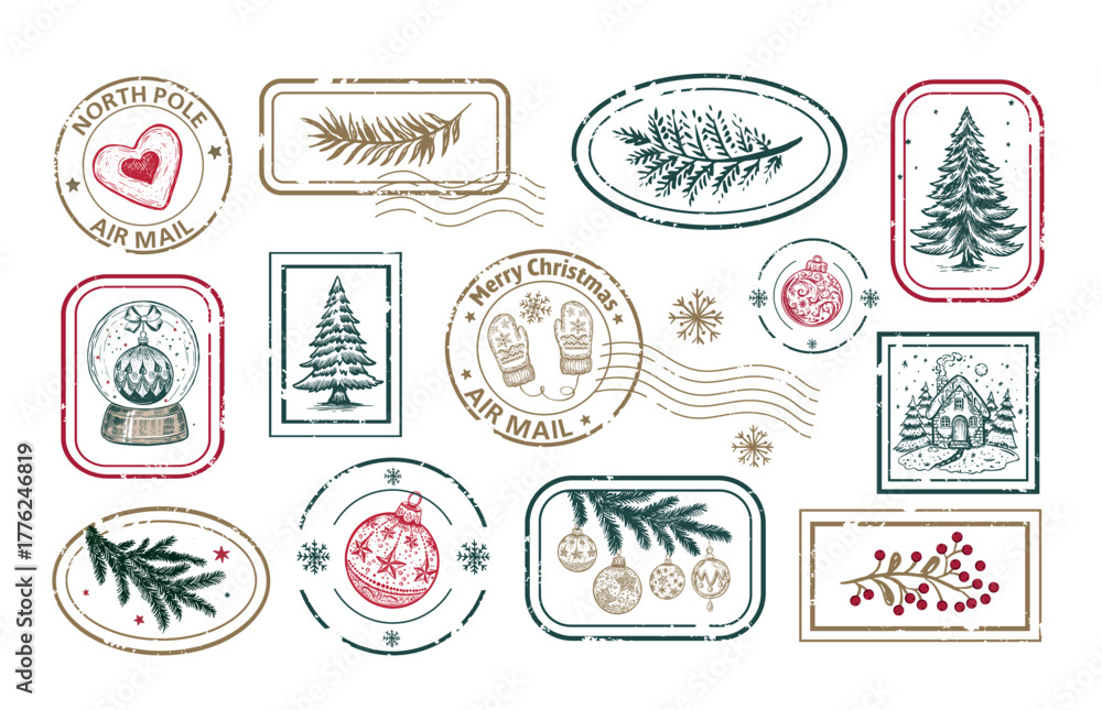 Fototapeta na wymiar - Christmas Stamps, tree, toy, set, Hand drawn illustration .