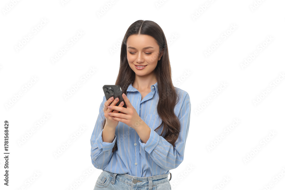 Fototapeta na wymiar - Woman enjoys using her smartphone while standing and smiling, PNG.