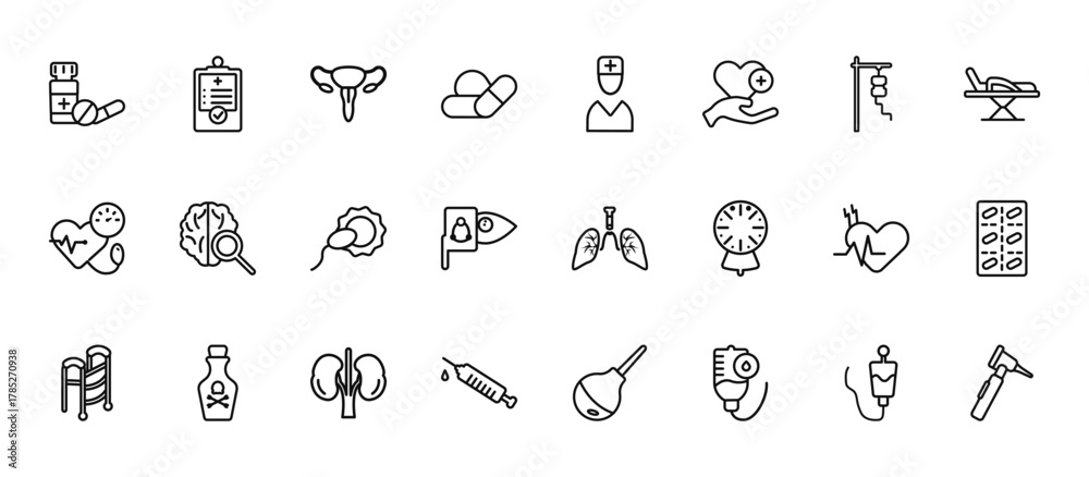 Fototapeta na wymiar - 24 set of outline web health and medical icons such as medical result, medical, neurology, heart rate, injection vector thin icons for report, presentation, diagram, web design, mobile app.
