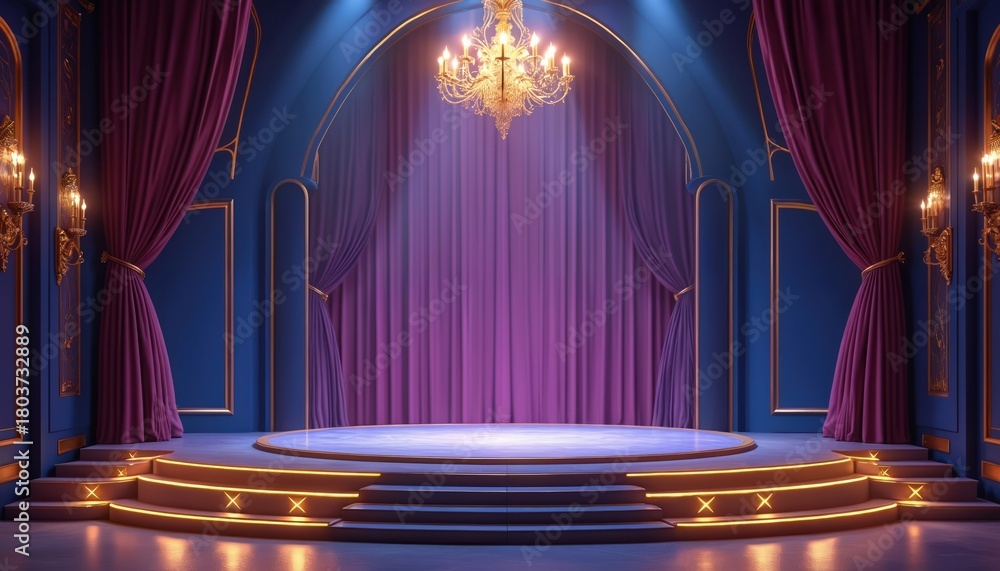 Fototapeta na wymiar - Empty luxurious stage with royal blue walls and purple velvet curtains. A grand chandelier hangs above a circular platform with illuminated steps for performances or award ceremonies..
