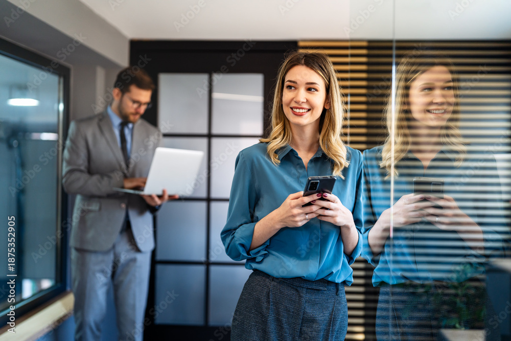 Fototapeta na wymiar - Successful executive standing proudly in office, representing business growth, partnership.