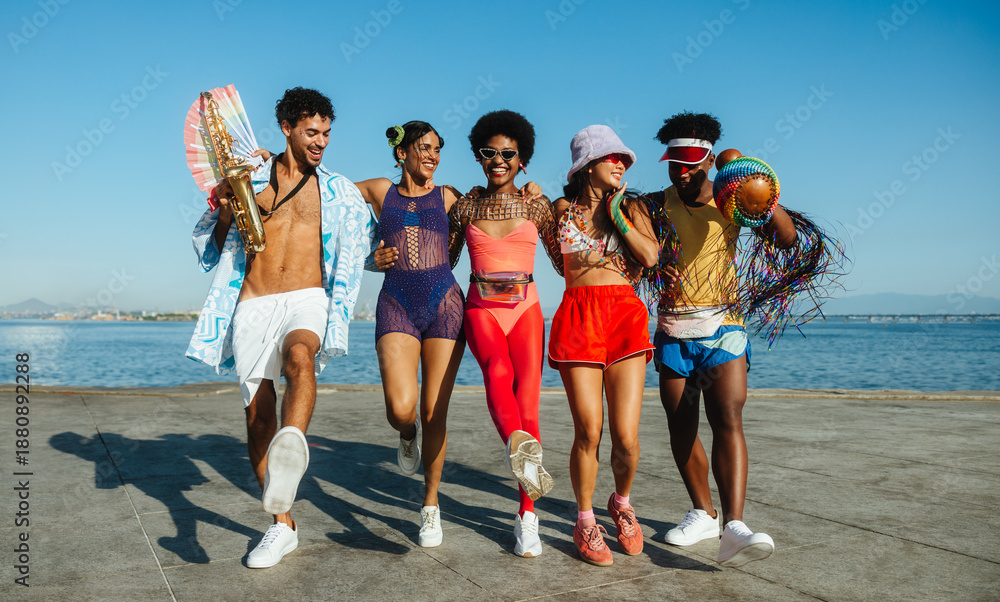 Fototapeta na wymiar - Friends group dancing on boardwalk during carnival.