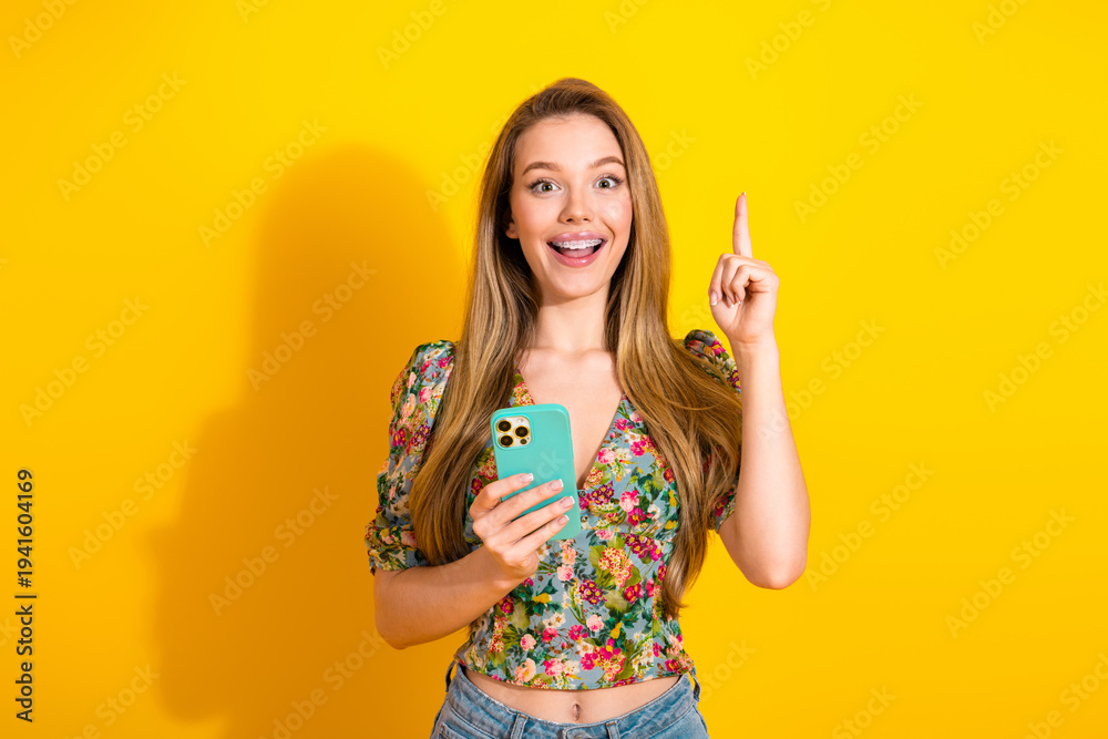Fototapeta na wymiar - Young stylish woman with floral top and phone posing against bright yellow background.
