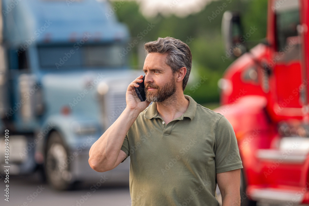 Fototapeta na wymiar - Man trucker driver at truck. Semi trucks vehicle. Hispanic man trucker. Mobile communication. Mature man driver truck talk on phone. Trucking owner. Truck driver has phone call. Logistical networking.