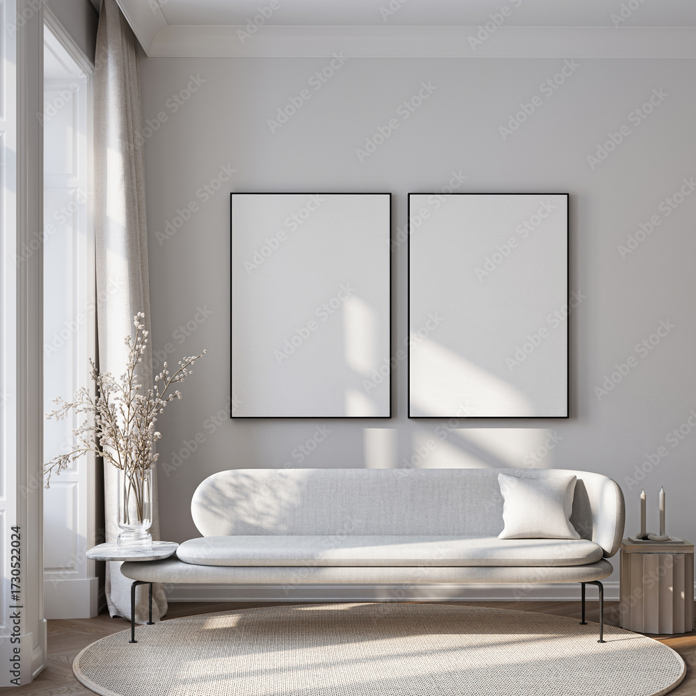 Fototapeta na wymiar - Modern Living Room Poster Frame Mockup with Natural Light and Minimalist Decoration. 3D render..