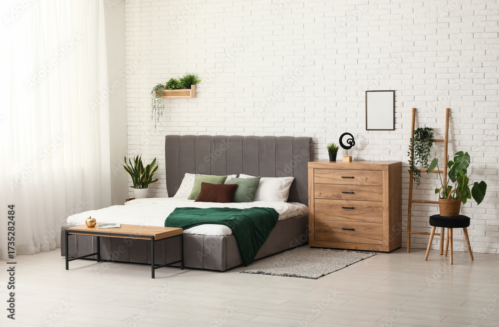 Fototapeta na wymiar - Stepladder, houseplants and chest of drawers near white brick wall in interior of bedroom.