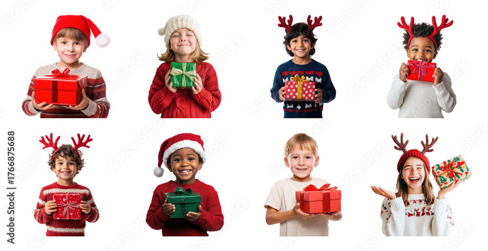 Fototapeta na wymiar - PNG Children holding colorful Christmas gifts, element set on transparent background.