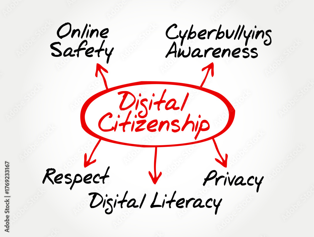 Fototapeta na wymiar - DIGITAL CITIZENSHIP concept diagram in handwriting style, showing key ideas like online safety, cyberbullying awareness, respect, privacy, and digital literacy on background.