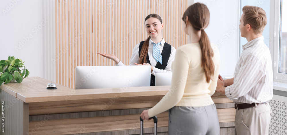 Fototapeta na wymiar - Receptionist welcoming guests at reception desk in hotel.
