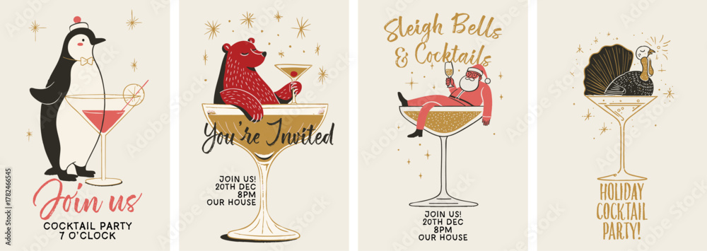 Fototapeta na wymiar - Festive Christmas cocktail party poster set with holiday characters and vintage drink illustrations.