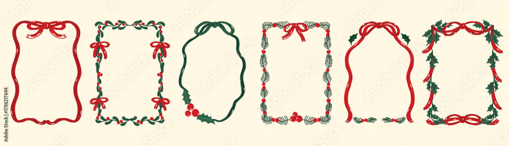 Fototapeta na wymiar - Christmas frame vector illustration set with red and green ribbons, bows, holly leaves and festive decorations — elegant holiday design for greeting cards, invitations, posters and packaging prints..
