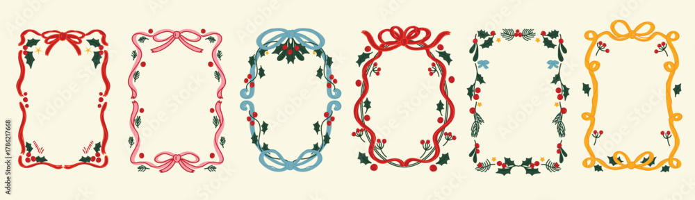 Fototapeta na wymiar - Christmas frame vector illustration set with red and green ribbons, bows, holly leaves and festive decorations — elegant holiday design for greeting cards, invitations, posters and packaging prints..