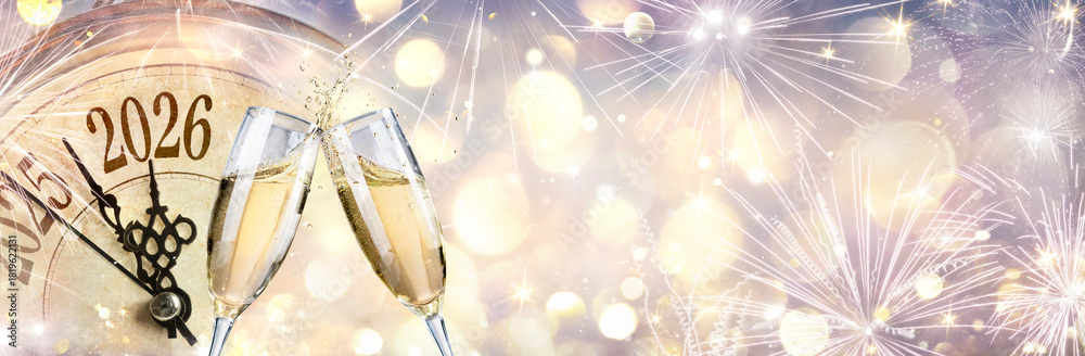 Fototapeta na wymiar - 2026 - New Year Celebration With Champagne And Clock - Toast With Flutes - Abstract Defocused Bokeh Lights.