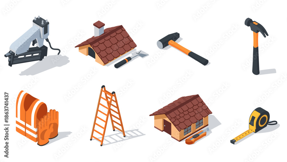 Fototapeta na wymiar - Isometric construction tools and equipment set featuring hammer, ladder, and roof elements.