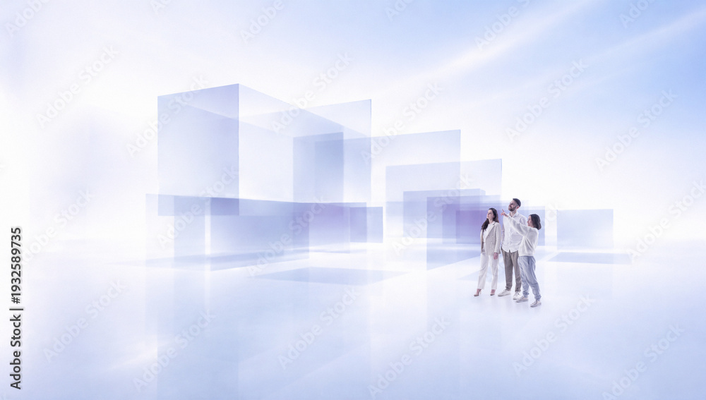 Fototapeta na wymiar - Futuristic composition three people standing near transparent building volumes in white abstract environment. Concept of real estate launch campaign and property investment marketing..