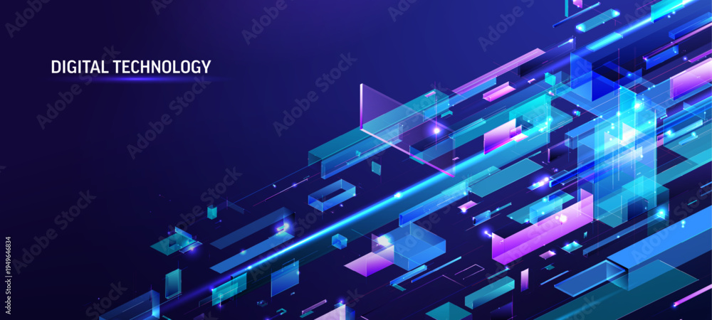 Fototapeta na wymiar - Dynamic digital technology background. Abstract isometric flow, glowing fragments, lines. AI, big data network concept for modern business, cyber security, communication. Futuristic blue-purple design.