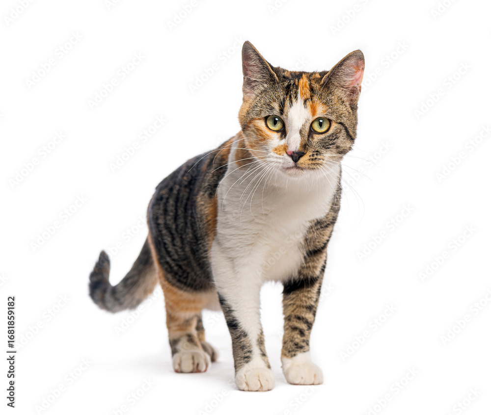 Fototapeta na wymiar - Harlequine cat standing on white background.