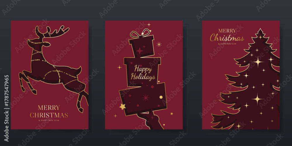 Fototapeta na wymiar - Red Christmas Luxury gold invitation card design vector. Christmas tree ,deer with gold foil and spot texture on red background. Design illustration for cover, print, poster, ads..