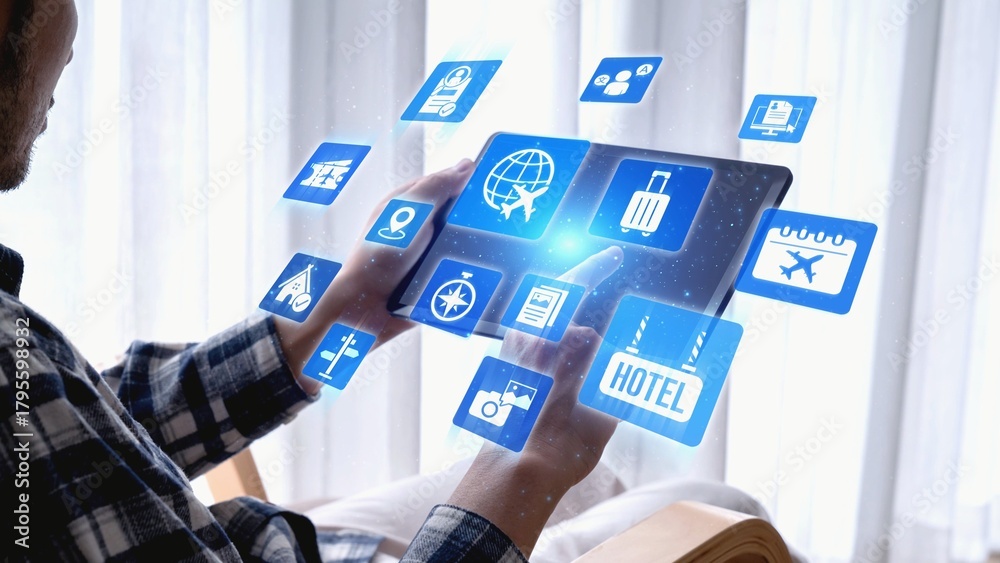 Fototapeta na wymiar - The concept of digital travel planning simplifies modern journeys. Using an online app for travel planning ensures a seamless experience from booking flights to finding hotels. Gist.