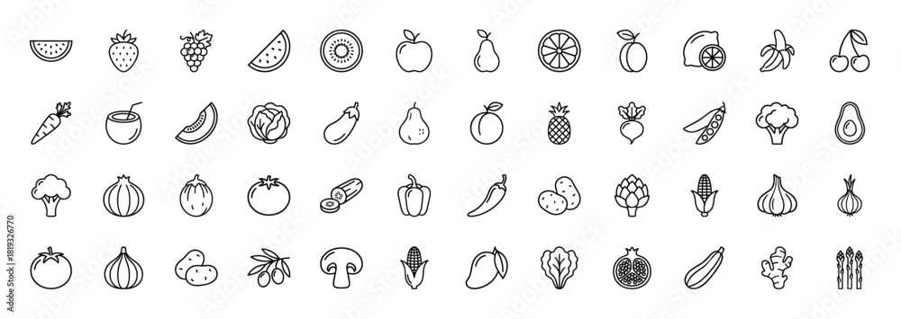 Fototapeta na wymiar - Fruits and vegetables line icon set. Vector pictograms of apple, pear, grapes, banana, lemon, carrot, broccoli, potato, and corn, thin linear illustration..