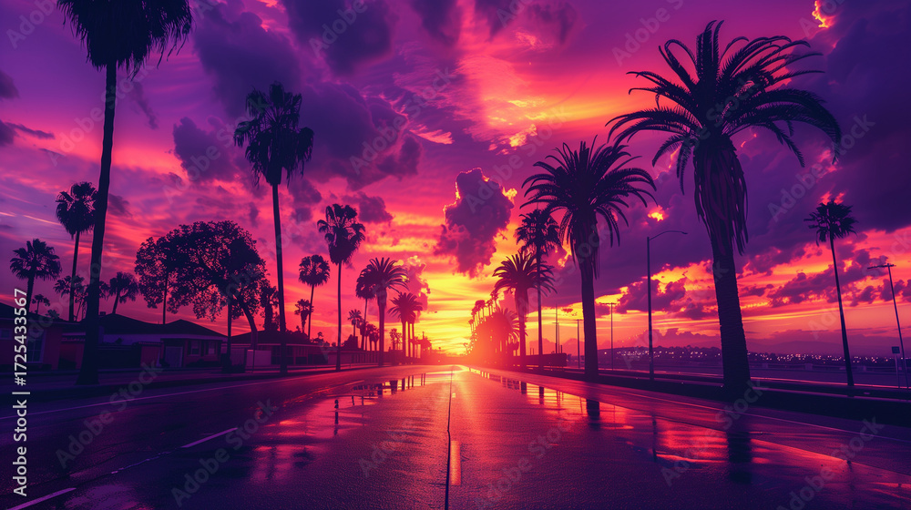 Fototapeta na wymiar - Palm trees at sunset, their colors blending across the sky in shades of pink, golden yellow, and purple..