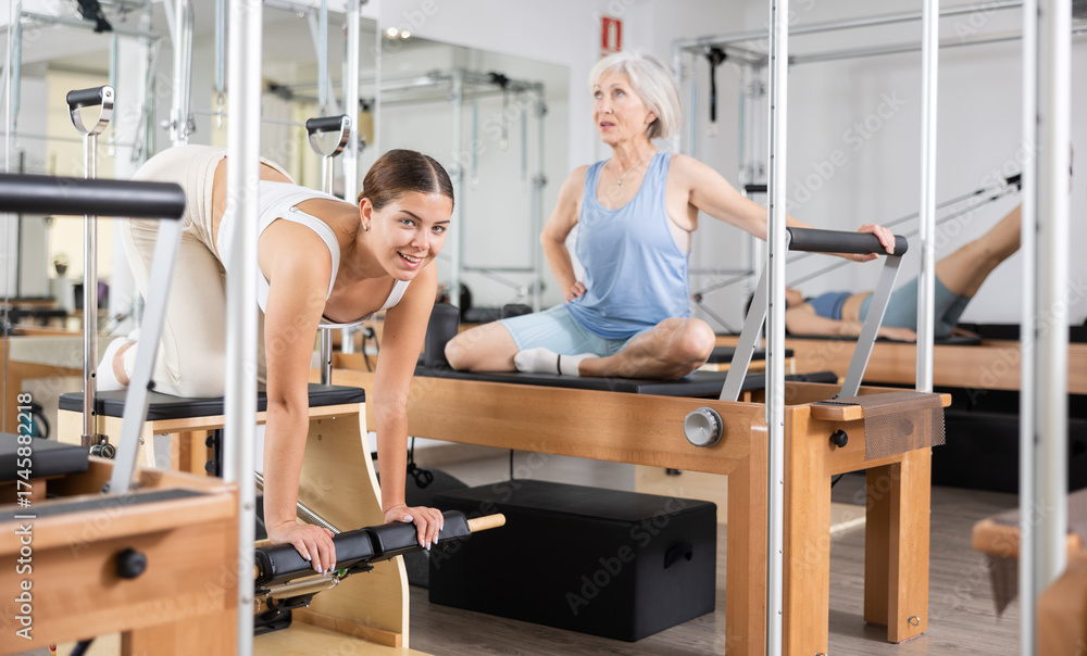 Fototapeta na wymiar - Young woman doing pilates exercises with a reformer bed.