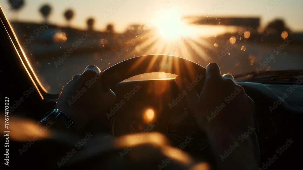 >Fototapety na wymiar>Wybrane motywy - zobacz więcej !>Wieś>Hands on a car steering wheel at sunset, sunburst through the windshield with bokeh lights in the distance. Concept Car interior photography, Sunset, Hands on wheel, Bokeh lights
