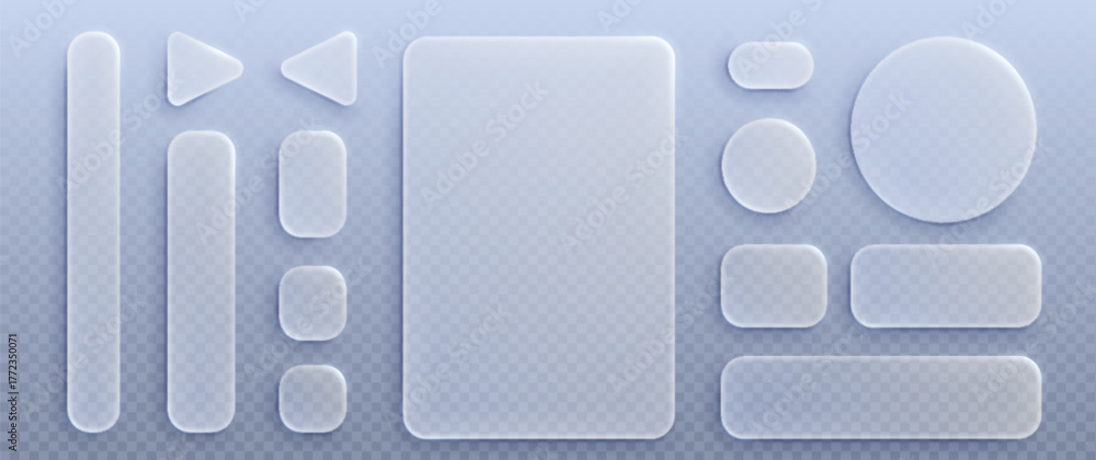 >Fototapety na wymiar>Wybrane motywy - zobacz więcej !>Wieś>Liquid glass ui design elements set isolated on transparent background. Vector realistic illustration of rectangle, round, triangle shape windows and buttons, computer app interface, game icons
