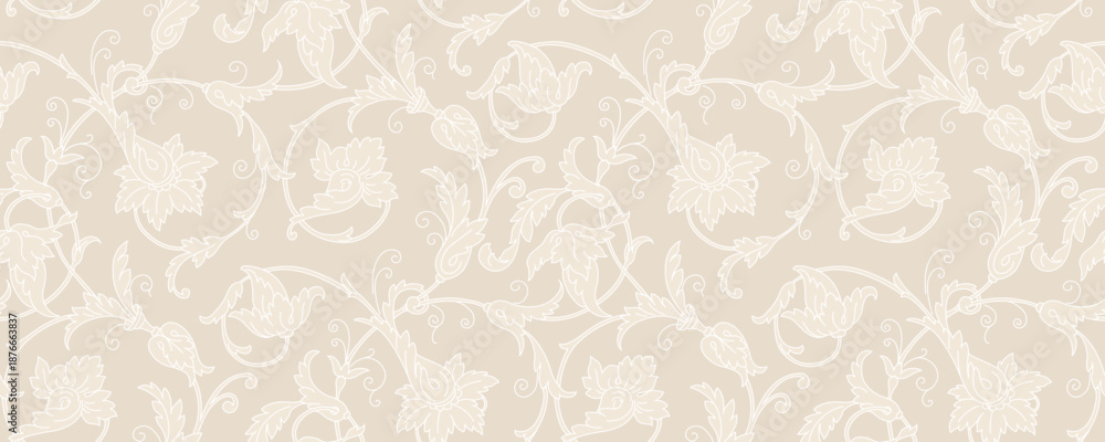 Fototapeta na wymiar - Elegant ivory beige floral vector pattern with chinoiserie motifs, vintage botanical blooms, and intricate traditional leaves for sophisticated textile designs.